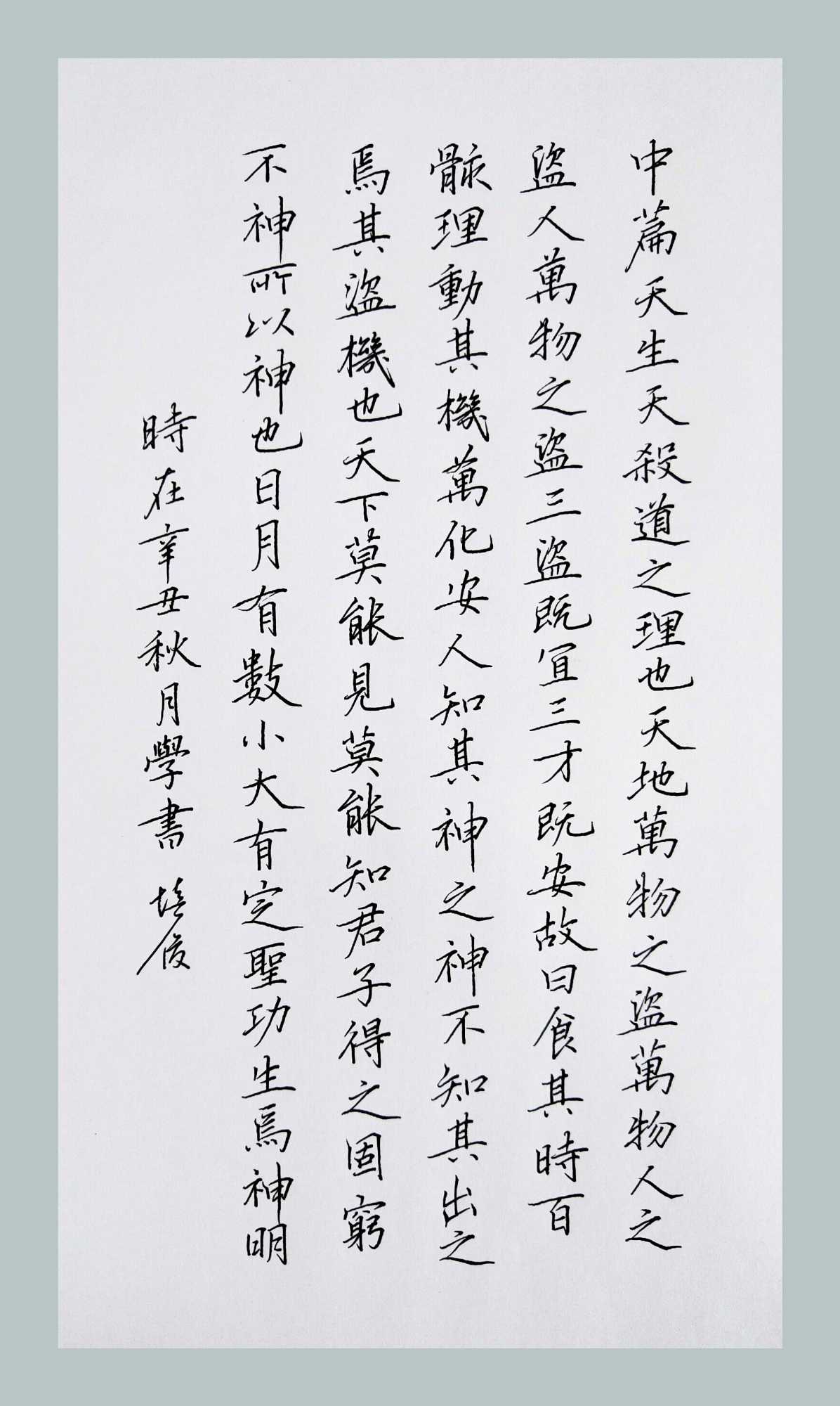 特别是2019年有幸结识了达州市硬笔书法协会的黄伟老师和林少武老师,在二位老师的悉心引导和鼓励下我再次走近了书法艺术的殿堂,先后临习了钟绍京的《灵飞经》王宠的《游包山集》王献之的《洛神赋十三行》王羲之的《黄庭经》《乐毅论》《孝女曹娥碑》等字帖,颇有收获。