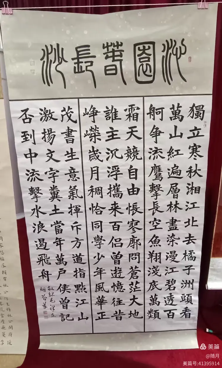 1. 曾革老师: 作品《沁园春 . 长沙》用魏碑书写。唐楷结合魏碑搞创作,感觉有特色。作品要有形式感,采用三拼,每一拼取三竖条,标题用篆书,看起来显高古。