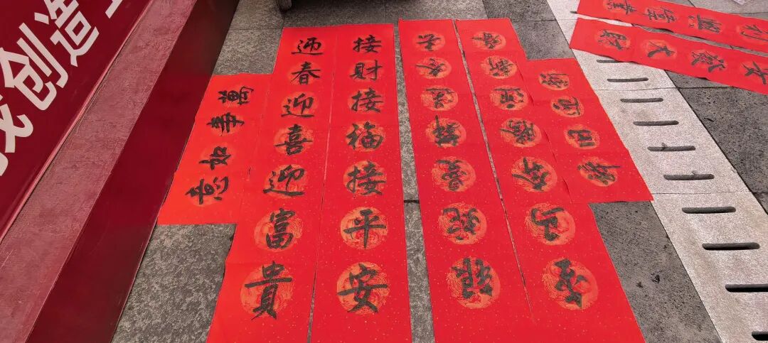 活动现场墨香四溢、红纸铺展。书法志愿者们挥毫泼墨,笔走龙蛇,将新春的祝福凝聚在一笔一划之间。“驰马迎新岁,鸣凤报春晖”等一副副寓意吉祥、充满年味的春联跃然纸上,不仅传递出浓浓的年节气氛,也寄托了对社区居民美好生活的诚挚祝愿。居民们纷纷围拢欣赏,领取心仪的春联,脸上洋溢着喜悦的笑容。