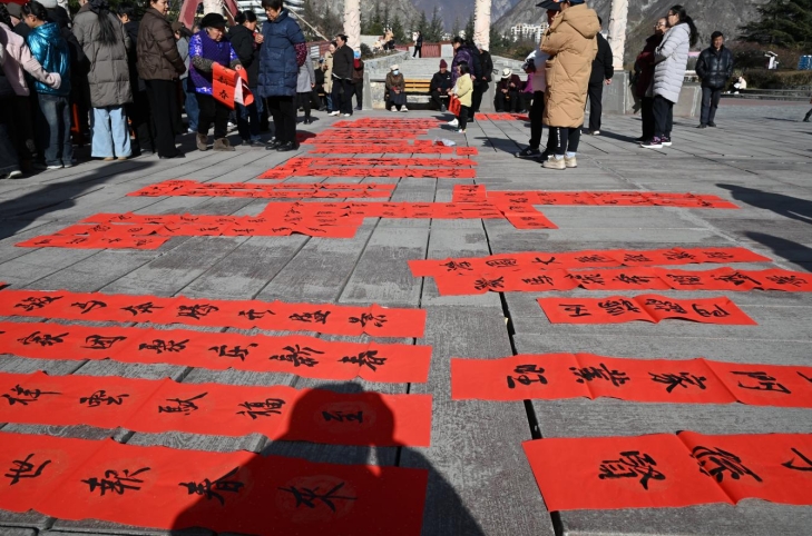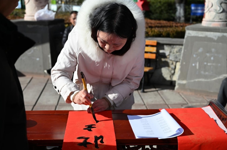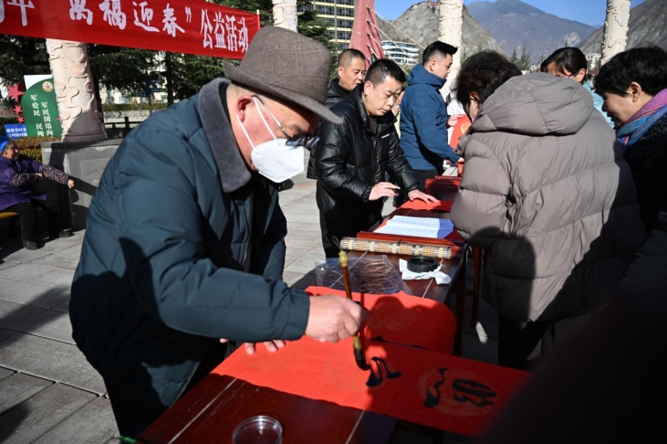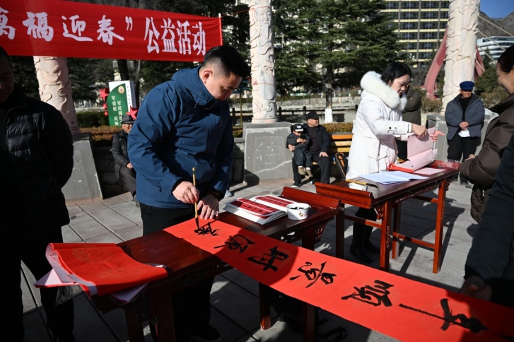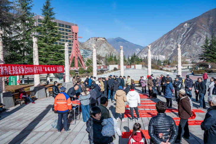 岁末冬寒,年味渐浓。为响应中国书法家协会发起的全国统一“万福迎春”公益活动,根据四川省书法家协会《关于开展2026丙午马年“万福迎春”公益活动的通知》、四川省硬笔书法协会《关于春节前夕展“永远听党话,笔墨润万家”书春送祝福活动的通知》文件精神以及阿坝州书法家协会文化惠民部署,2026年1月18日,九寨沟县书法协会组织十余位骨干会员,在县城新区广场,将饱含祝福的“文化年货”送到群众手中,让中华优秀传统文化在九寨大地传递暖意。